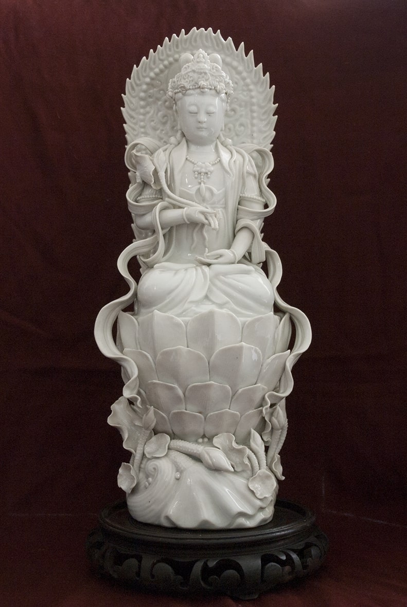 Statuette of Quanyin, Eastern deity of mercy, seated on a lotus flower base in front of glory. At the base a square with four ideograms.