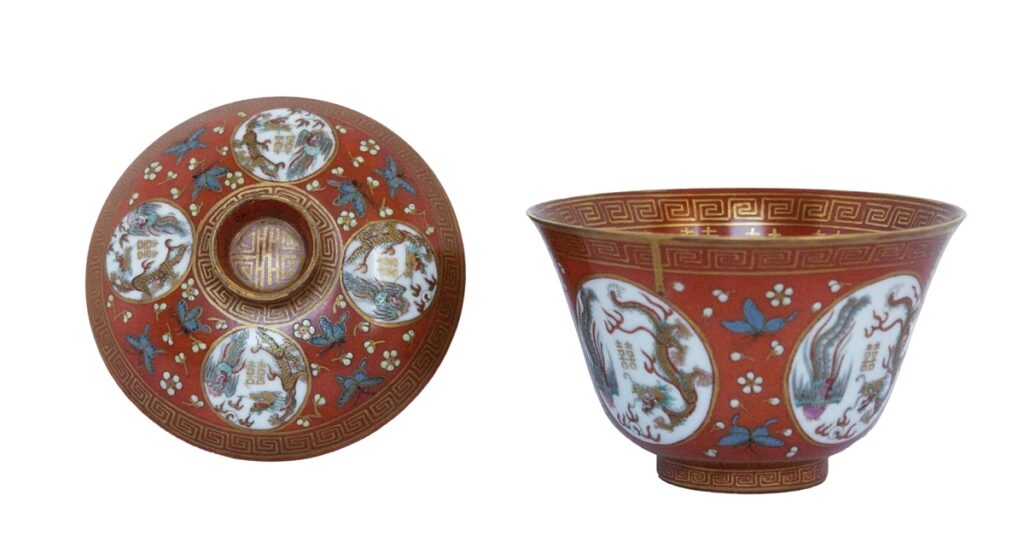 Jar with stopper. On a plain of orange-red enamel varied with flowers, petals, birds, butterflies and meanders, four raised circular areas decorated with dragons, palm trees, flames and symbols are formed. the inside long inscription with golden ideograms and meanders. At the base four ideograms.