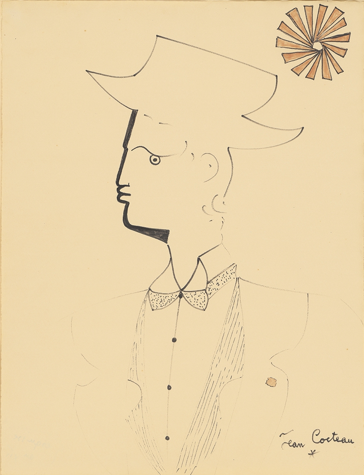 Profile portrait of male figure in hat and formal dress. A stylized sun is rendered in the upper right.