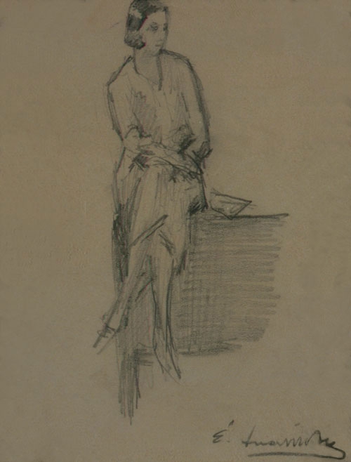 Seated female figure in dress and neck-length hair. She sits cross-legged and has her hands resting on her legs. It is facing from the middle and up towards the left side.