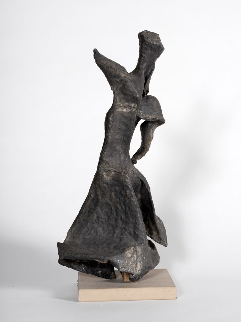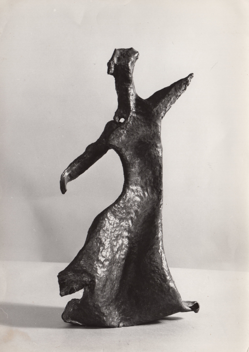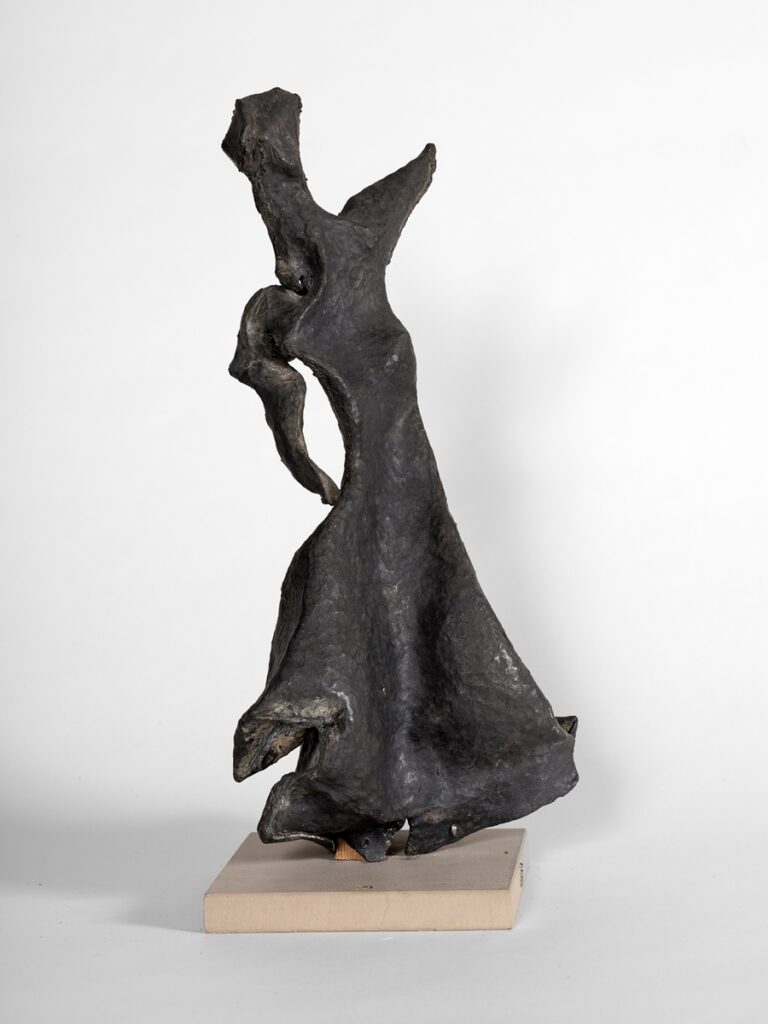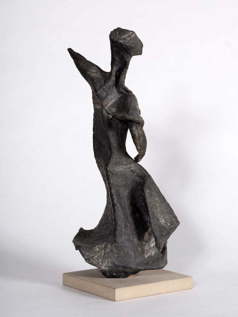 Radiant female form with long pleated dress in movement and turning of the torso.
