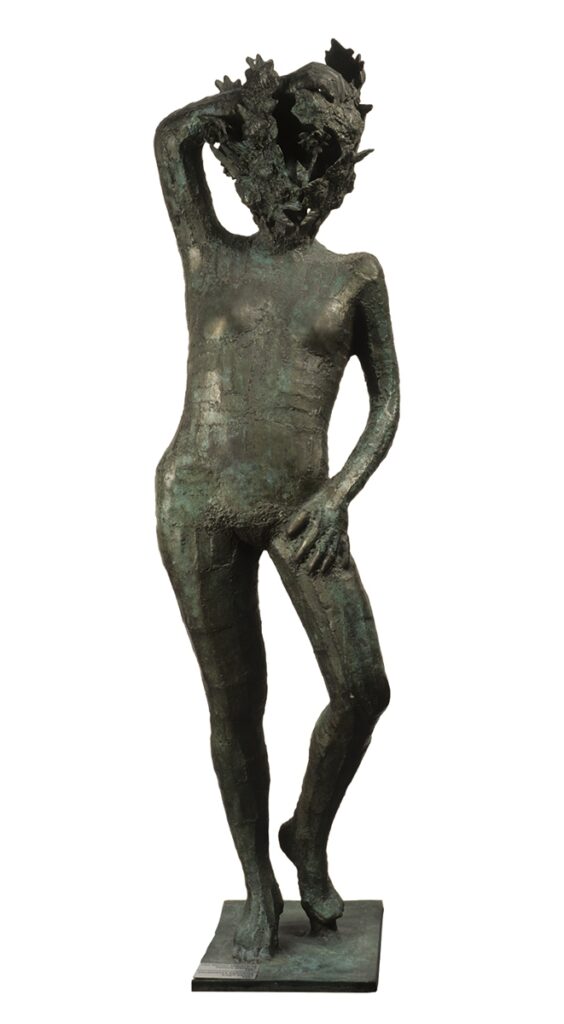 Standing female figure with a head shaped from laurel leaves (the nymph Daphne during her transformation). Her posture is reminiscent of a figura serpentinata. The right leg is slightly in front of the left and the right hand rests on the right hip. The left hand is raised high and rests on her head, forming an angle. The base is integrated into the sculpture and made of the same material.