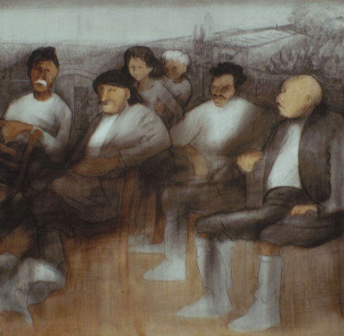 Group of people outdoors. In the background landscape. Left to right there are four seated men (three elders and one younger). In the back two figures.