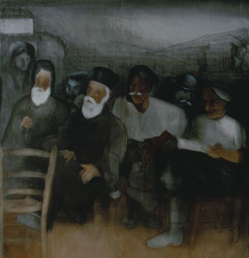 Outside human figures. From the left a woman standing. Two priests with white beards sit next to it. A little further back four male figures seated. House (perhaps church) behind woman. Ridges in the background.