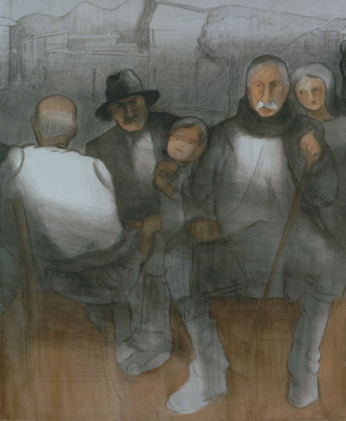 Five human figures. To the left sits an old man with his back to the viewer. Next to him, wearing a hat, another with a child sitting on his knees. Frontal on the right part of the canvas a third old man seated holding a cane. A child can be seen behind him.