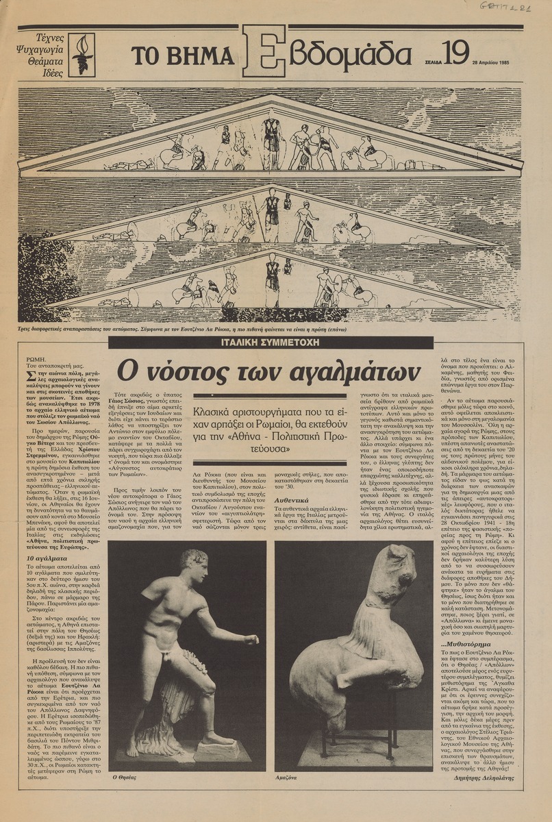A clipping from the newspaper “To Vima”, dated April 28, 1985, featuring an article on the first exhibition by the reconstructed ancient Greek pediment that adorned the Roman temple of Apollo Sosianus in Rome.