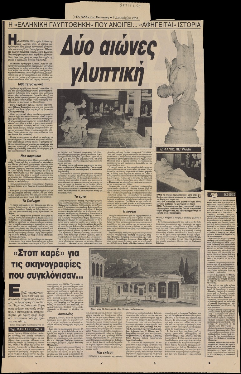 A clipping from the newspaper “Ta Nea”, dated December 9, 1984, featuring an article on the opening of the Greek Sculpture Gallery in Athens4.