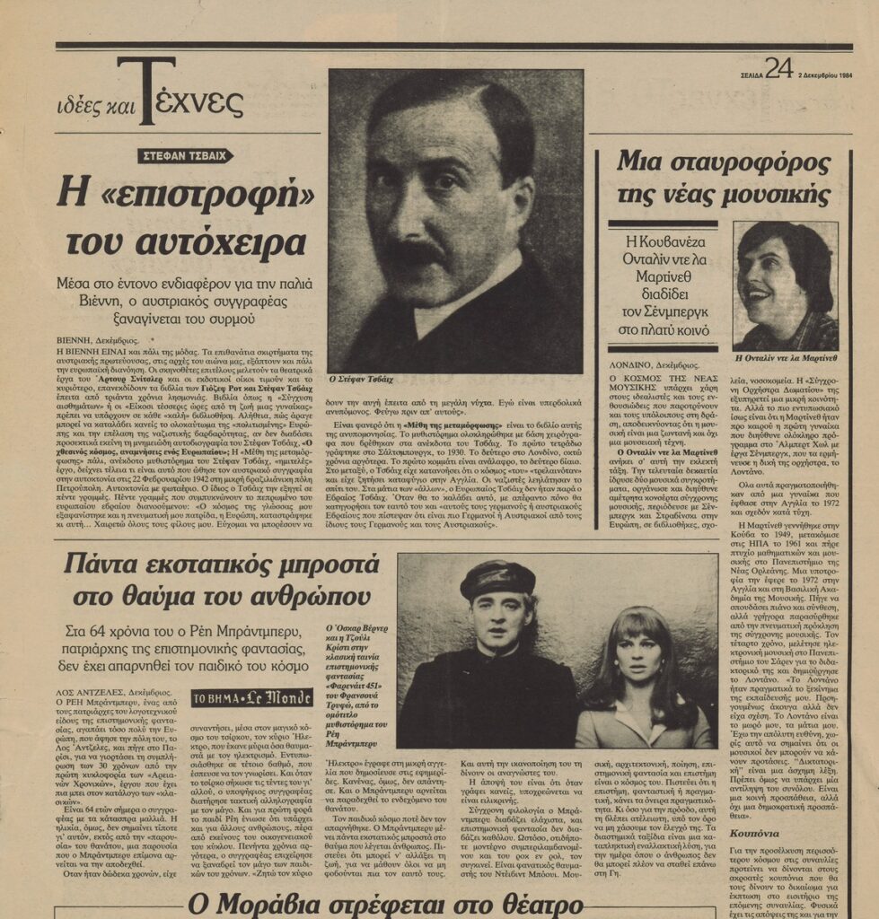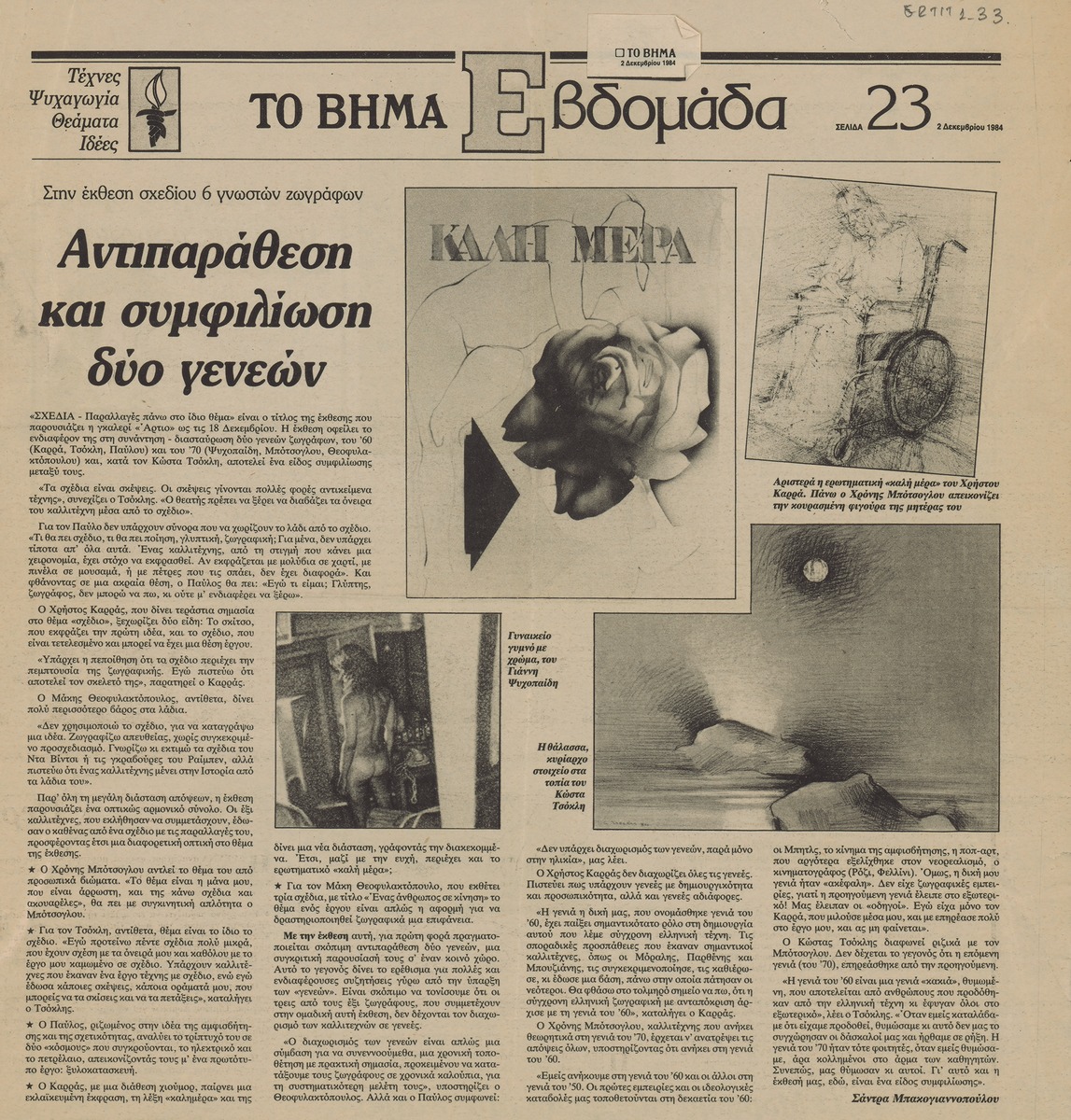 A clipping from the newspaper “To Vima”, dated December 2, 1984, featuring an article on the exhibition “Drawings – Variations on the same theme” organized by the “Artio” gallery in Athens.