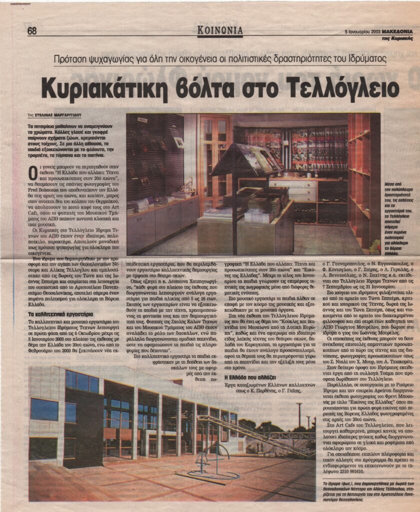 A clipping from the newspaper “Macedonia”, dated January 5, 2003, featuring an article on the Teloglion Foundation in Thessaloniki.