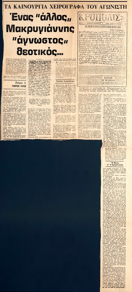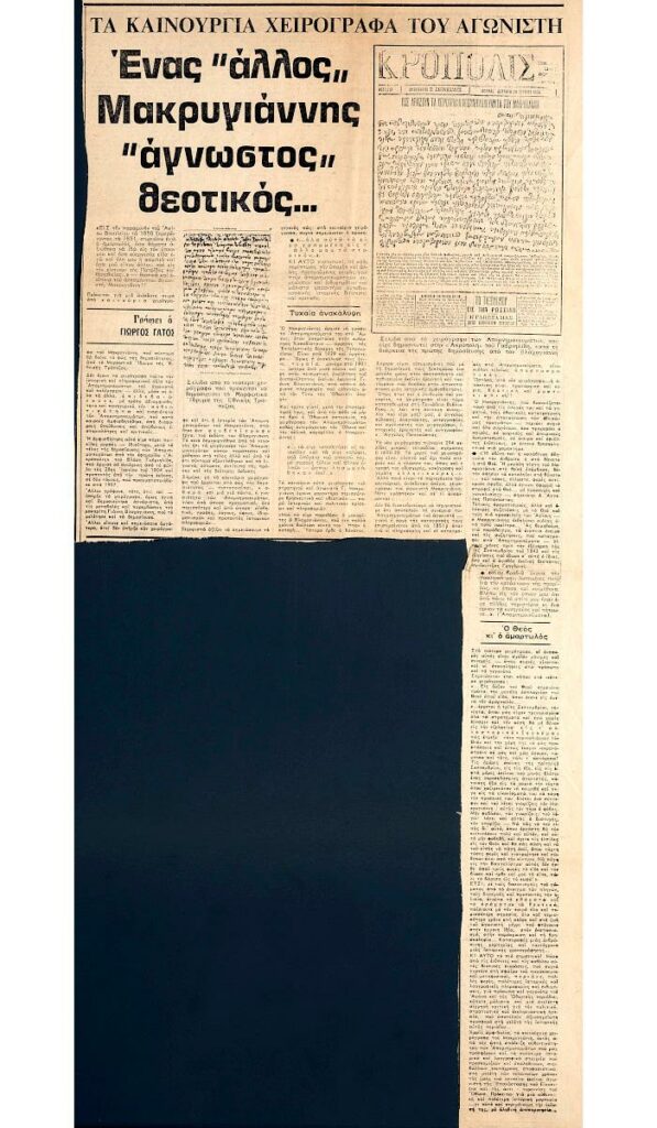 A clipping from the newspaper “I Kathimerini”, dated March 27, 1979, featuring an article on the issue of the publication of the manuscripts of General Makrygiannis, by the Educational Foundation of the National Bank.