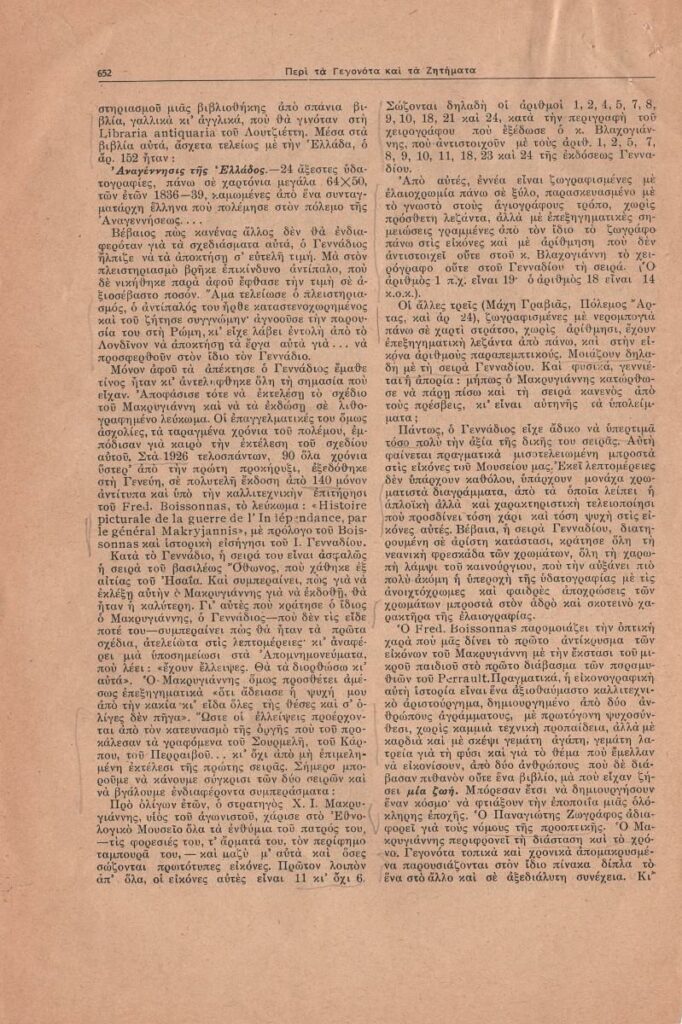 A clipping from the magazine “Nea Estia,”, dated May 1, 1936, featuring an article about an exhibition of artworks donated by the philhellene Dr. Jordan von Bassermann, depicting scenes from the Greek Revolution. The exhibition took place at the “Parnassos’ Philological Association in Athens, organized by the Historical and Ethnological Society.