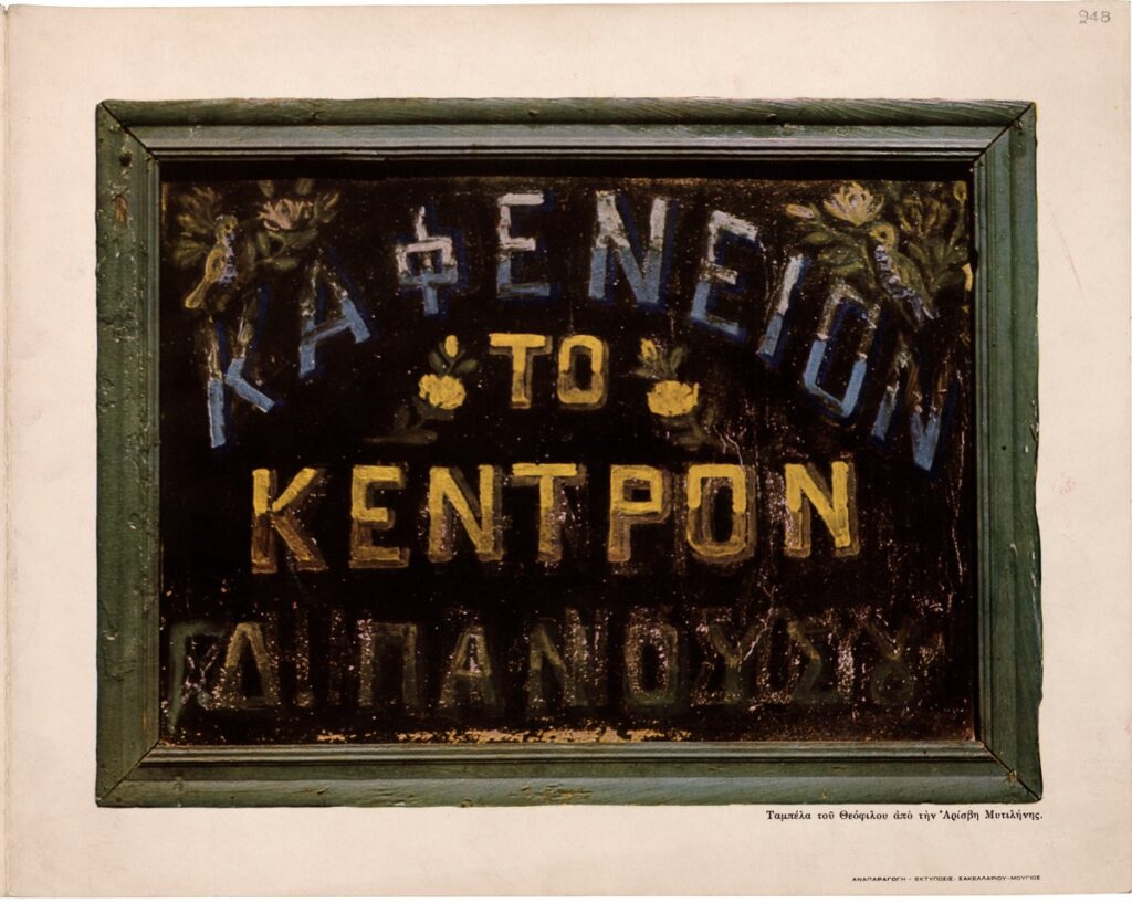 Pamphlet featuring color reproductions of shop signs from villages and towns in Greece, collected as part of the preservation of folk art inscriptions in Greece.