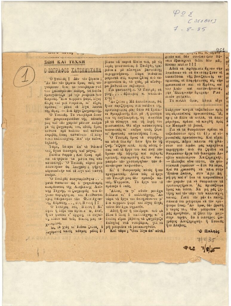 A clipping from the newspaper “Fos’ dated August 7, 1935, featuring an article on the folk painter Theophilos (Chatzimichail) and his works.