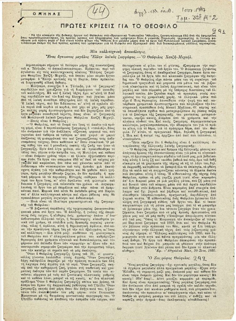 Έκθεση Θεόφιλου (Χατζημιχαήλ), Βρετανικό Ινστιτούτο, Αθήνα, 02/05/1947 - 31/05/1947