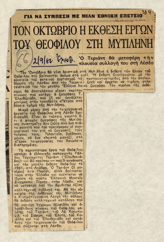 Paraskevaϊdis Miltis (1911 - 1999) ; Kanellis Orestis (1910 - 1979) ; Theofilos (Chatzimichail) (1871 - 1934) ; Eleftheriadis Takis (1911 - 1987) ; Eleftheriadis Stratis (1897 - 1983) ; Αποστόλος Γεραλής (1886 - 1983) ; Λουκάς Γεραλής (1875 - 1958) ; Protopatsis, Antonis (1897 - 1947) ; Γιάννης Μαρουδής ; Ιωσήφ Ραφτόπουλος ; Στρατής Αξιώτης (1907 - 1994) ; Νότης Εμμανουήλ ; Θεόδωρος Παπαχαραλάμπους ; Σίμος Χουτζαίος (1873 - 1967) ; Πελαγία Κούμπα ; Anatoleas, Phoebus (1895 - 1979) ; Μαριάνθη Πρίμου ; Κλεάνθης Καραφύλλης ; Μιχαήλ Χατζόπουλος ; Zelli, Anta ; Κρυσταλλίδη ; Μ. Βράντη ; Μ. Τσαγκαράκης ; Π. Βασιλείου ; Αθ. Λημναίος ; Κ. Κιρλής ; Γεώργιος Μπούκας (1879 - 1941) ; Αντωνακάκης