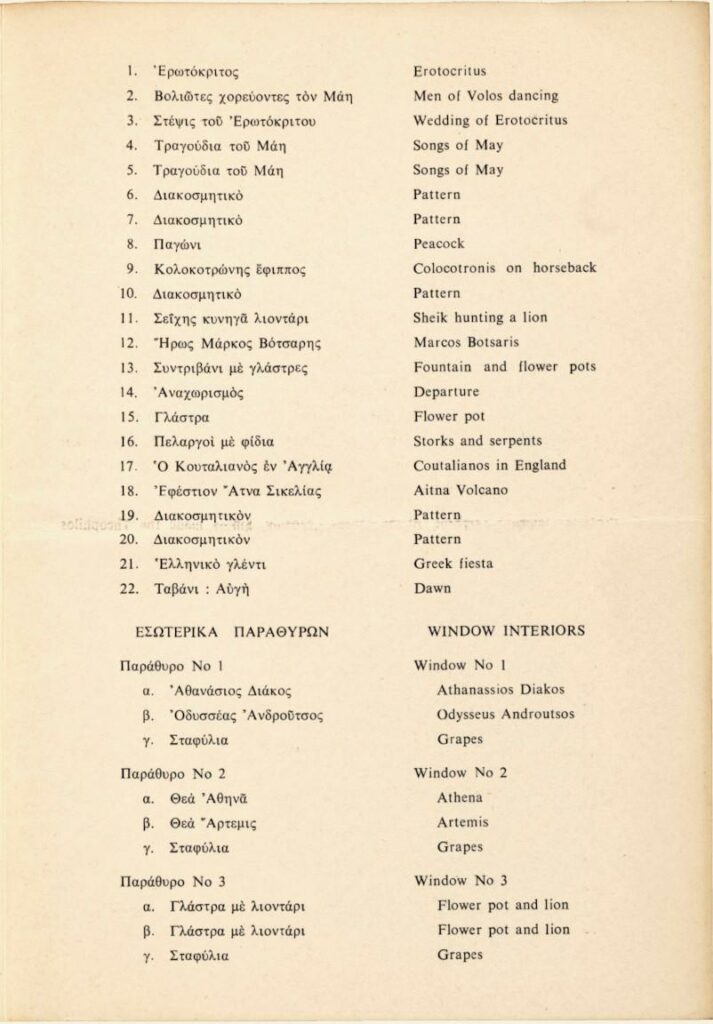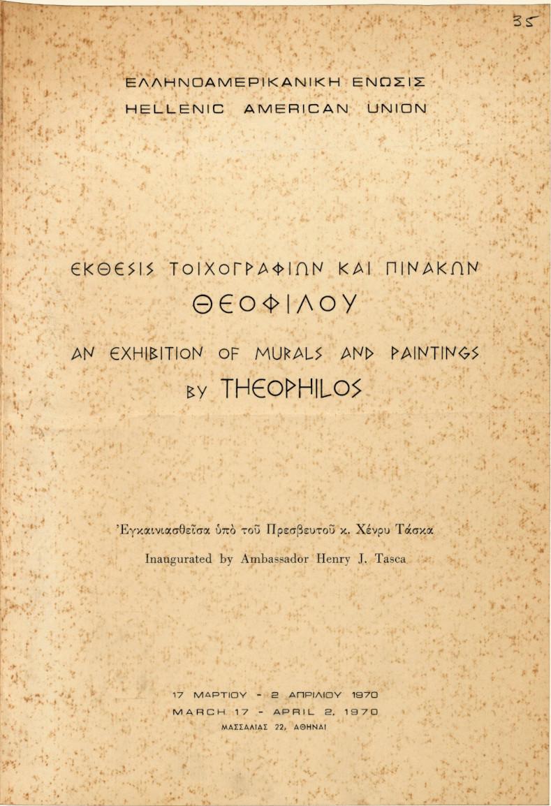 Pamphlet for an exhibition of works by the Greek folk painter Theophilos at the exhibition venue of the Hellenic-American Union in Athens, in the spring of 1970. It includes a list of the exhibited artworks and text.
