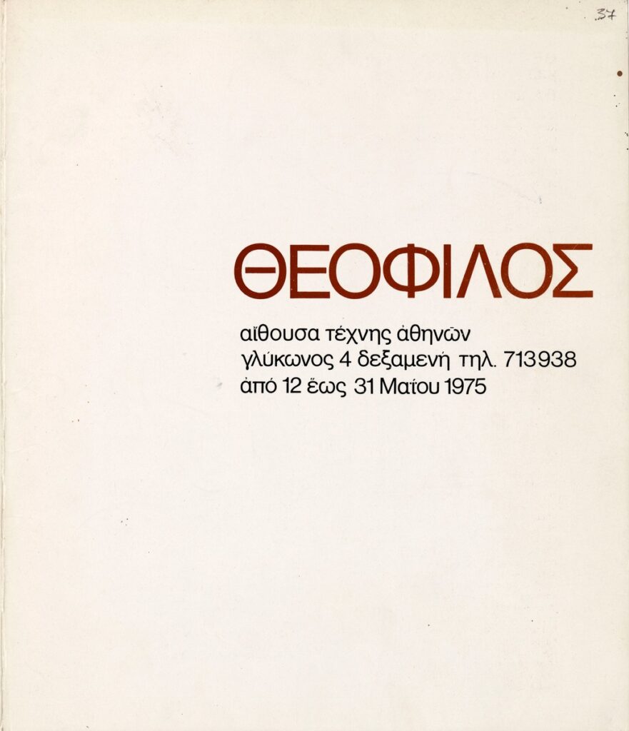 Pamphlet for the exhibition “Theophilos: Pelion-Mytilene”, at the Athens Art Gallery in May 1975. It includes an essay titled “Theophilos : Chieftain and Gatekeeper of Greek Painting”, a biographical note on the artist, and a list of the exhibited artworks.