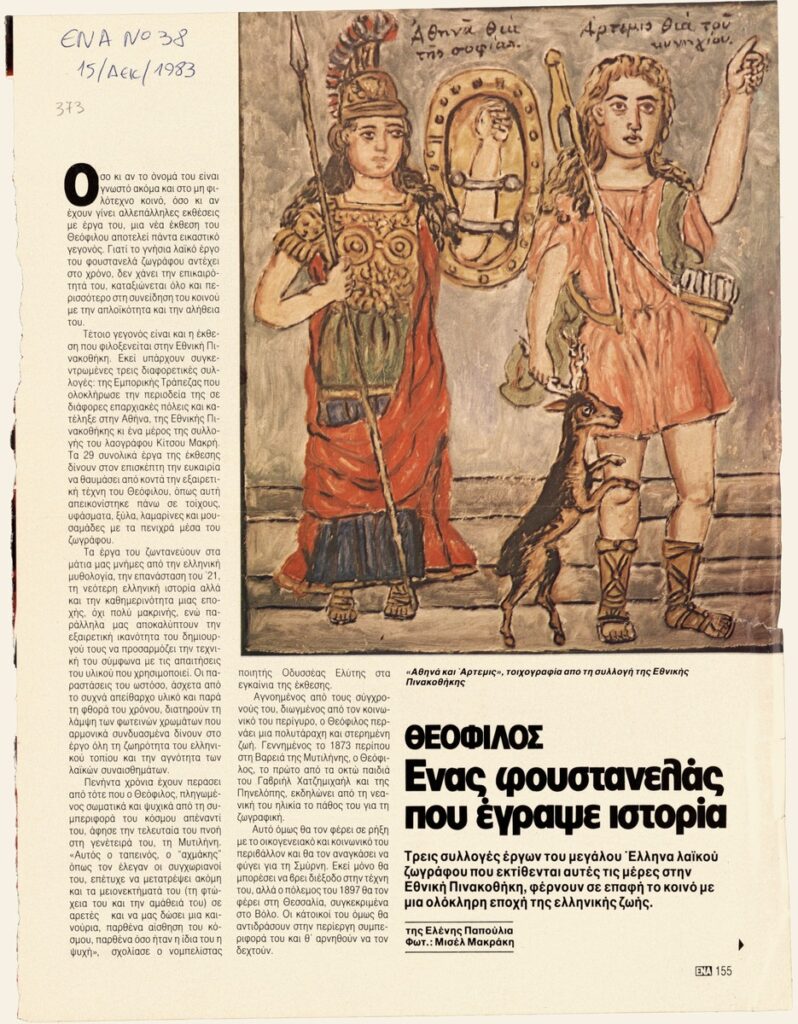 A clipping from the magazine “Ena”, issue 38, December, 1983, featuring an article on the exhibition by Theophilos at the National Gallery in Athens.
