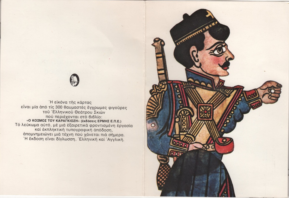 Photograph of a figure of the Karagiozi Shadow Theater on a greeting card, from the book “The World of Karagiozis” Ermis Editions Ltd.