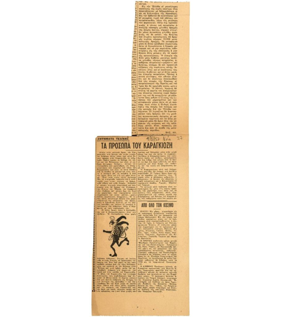 A clipping from the newspaper “Ta Nea”, dated August 9, 1952, featuring an article about the characters of the Karagiozis Shadow Theater.