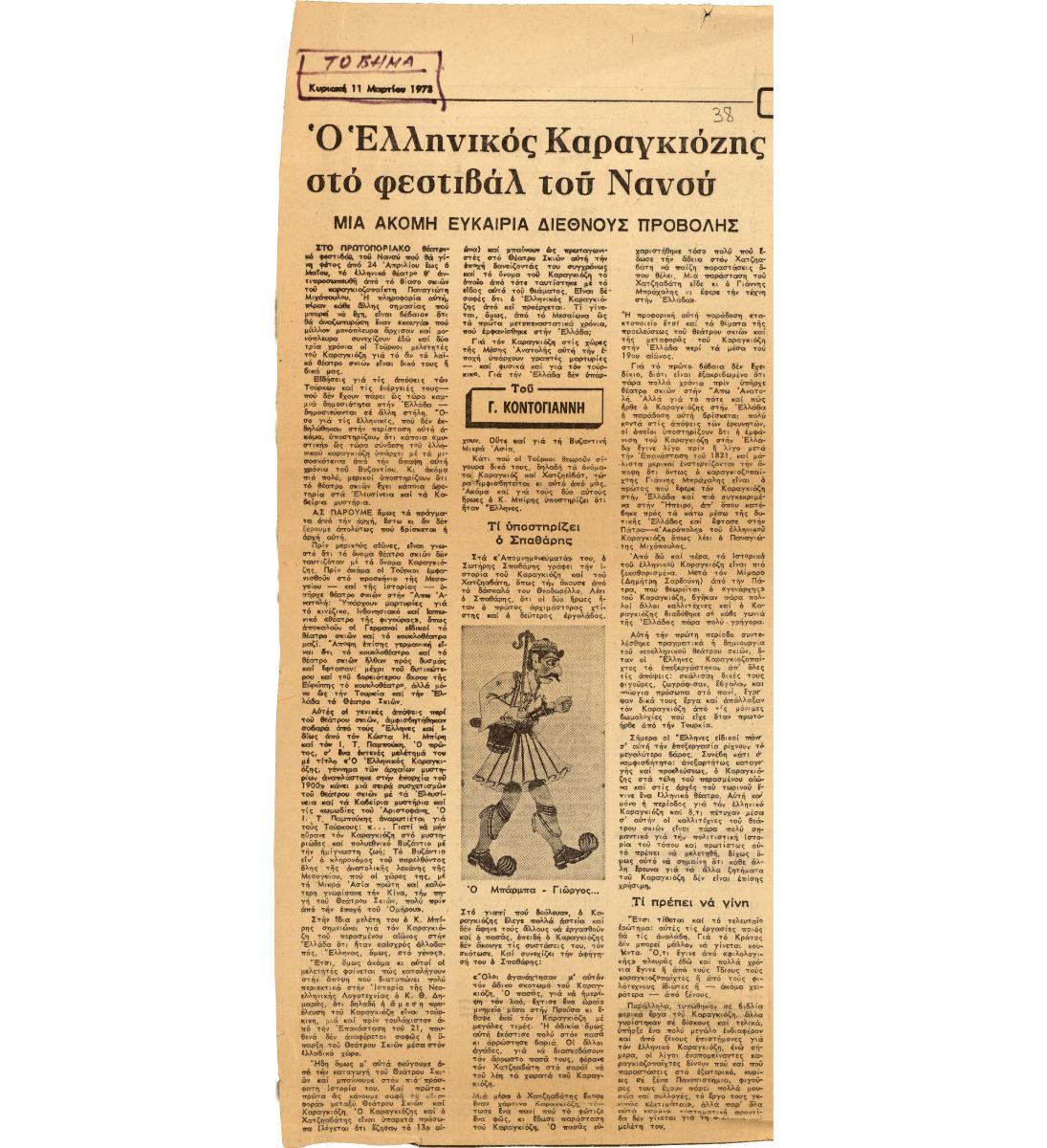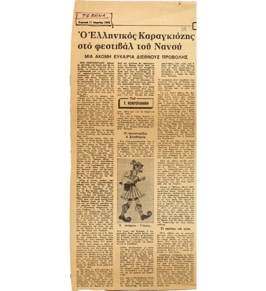 A clipping from the newspaper “To Vima”, dated March 11, 1973, featuring an article on the participation of Panagiotis Michopoulos’ Karagiozis Shadow Theater Company in the Nancy Festival in France.