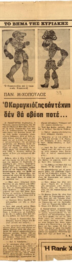 A clipping from the newspaper “To Vima”, dated March 11, 1973, featuring an interview of Panagiotis Michopoulos, head of a Karagiozis Shadow Theater Company, on the occasion of his participation in the Nancy Festival, in France.