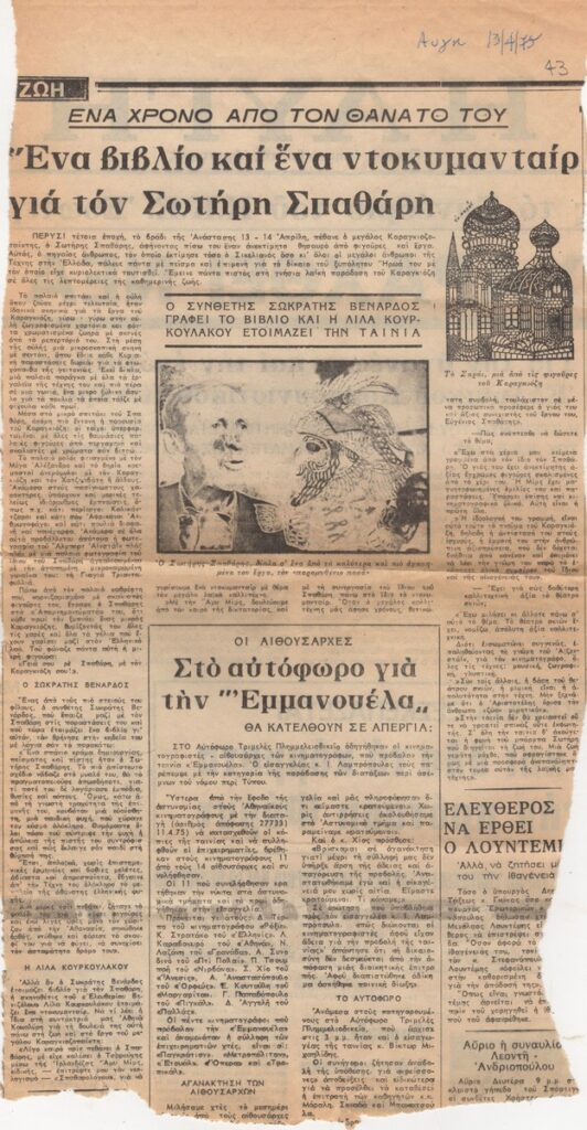 A clipping from the newspaper “I Avgi”, dated April 13, 1975, featuring an article on the upcoming publication of a book by Sokratis Venardos and the creation of a film to be directed by Lina Kourkoulakou on the subject of the Karagiozis Shadow Theater puppeteer Sotiris Spatharis.