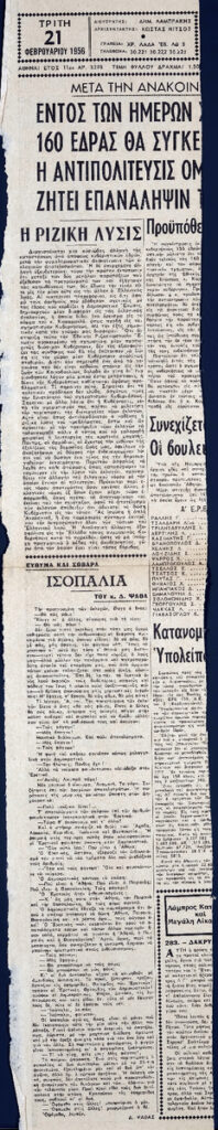 A clipping from the newspaper “Ta Nea”, dated February 21, 1956, featuring an art column