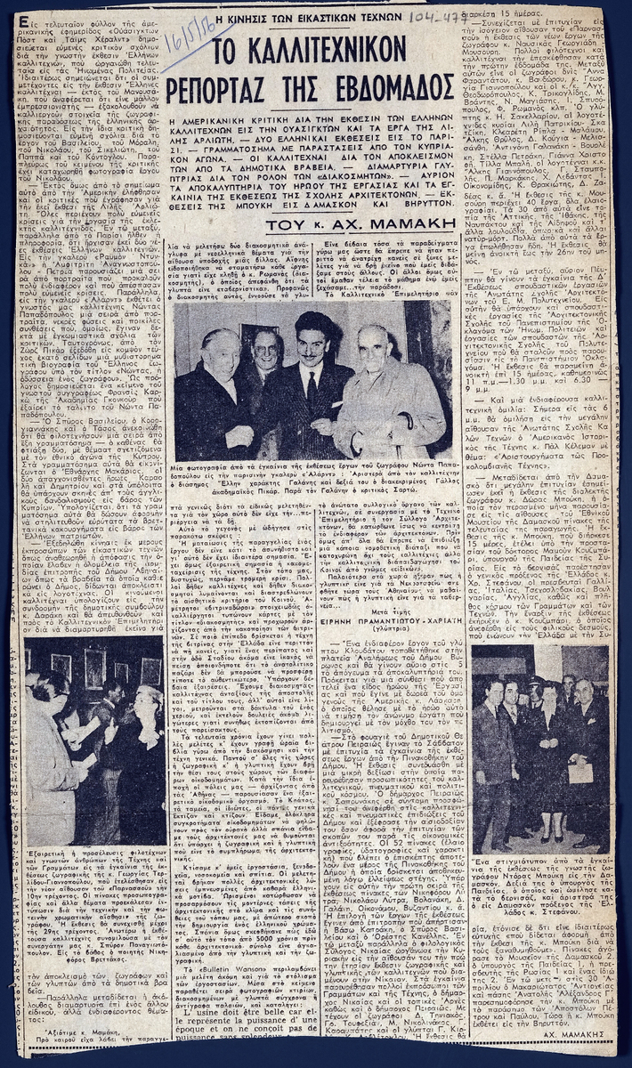 A clipping from the newspaper “Ethnos”, dated May 16, 1956, featuring an art column.