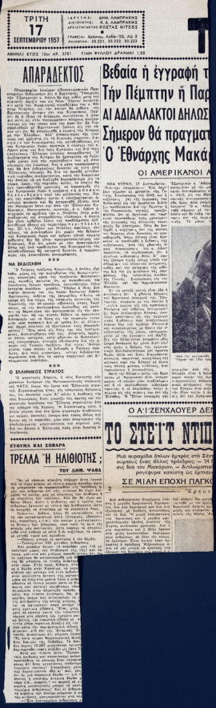 A clipping from the newspaper “Ta Nea”, dated September 17, 1957, featuring an art column.