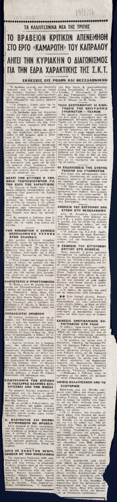 A clipping from the newspaper “Ta Nea”, dated August 13, 1957, featuring an art column. In the same clipping: “The competition for the Chair of Engraving of the School of Fine Arts ends on Sunday.