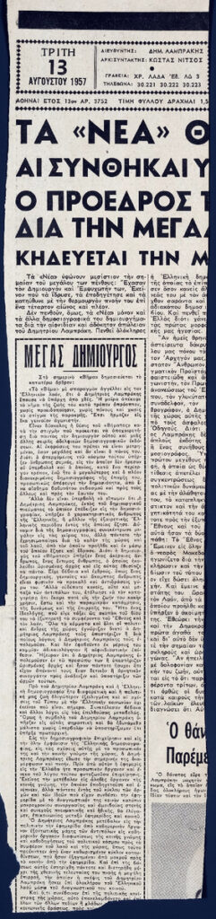 A clipping from the newspaper “Ta Nea”, dated August 13, 1957, featuring an art column. In the same clipping: “The competition for the Chair of Engraving of the School of Fine Arts ends on Sunday.