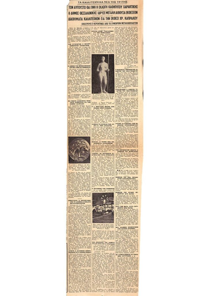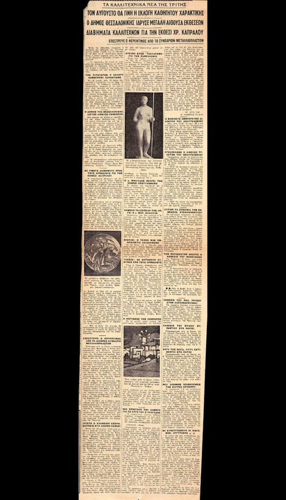 A clipping from the newspaper “Ta Nea”, dated June 11, 1957, featuring an art column. In the same clipping: “The municipality of Thessaloniki has established a large exhibition venue,” “Artists’ démarches for the Ch. Kapralos exhibition”.
