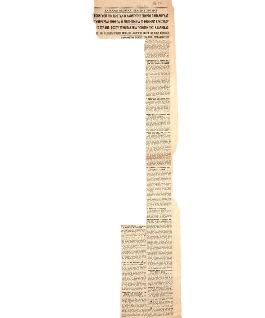 A clipping from the newspaper “Ta Nea”, dated June 4, 1957, featuring an art column. In the same clipping: “The committee for the Venizelos monument meets today,” “A work by Ant. Sochos in the Poets’ Square of Kallithea”.