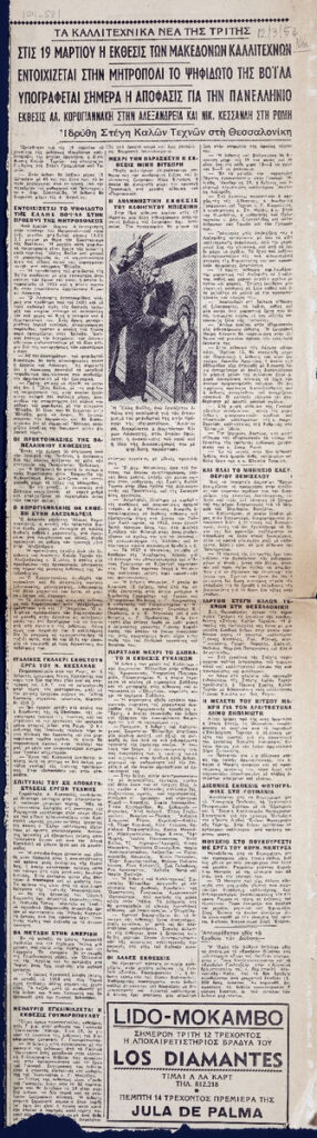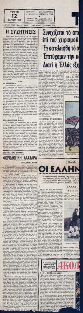 A clipping from the newspaper “Ta Nea”, dated March 12, 1957. In the same clipping: “Voila’s mosaic is installed in the Cathedral”, “The decision on Panhellenic Exhibition is signed today”.