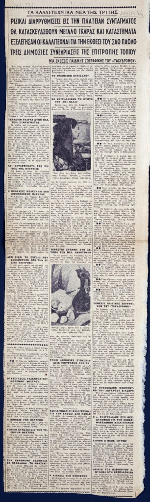 A clipping from the newspaper “Ta Nea”, dated January 29, 1957. In the same clipping: “Large garage and shops to be built”, “Artists chosen for Sao Paulo exhibition”, “3 public meetings of landscape commission”.