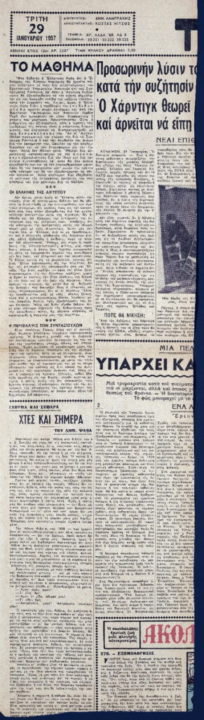A clipping from the newspaper “Ta Nea”, dated January 29, 1957. In the same clipping: “Large garage and shops to be built”, “Artists chosen for Sao Paulo exhibition”, “3 public meetings of landscape commission”.