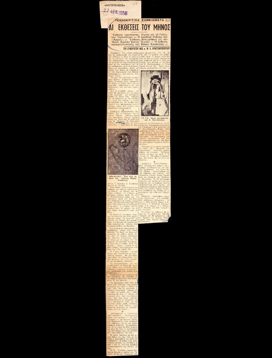 A clipping from the newspaper “Akropolis” dated December 27, 1958, featuring an article by M. X. Konstantopoulos about the art exhibitions that opened in December 1958.