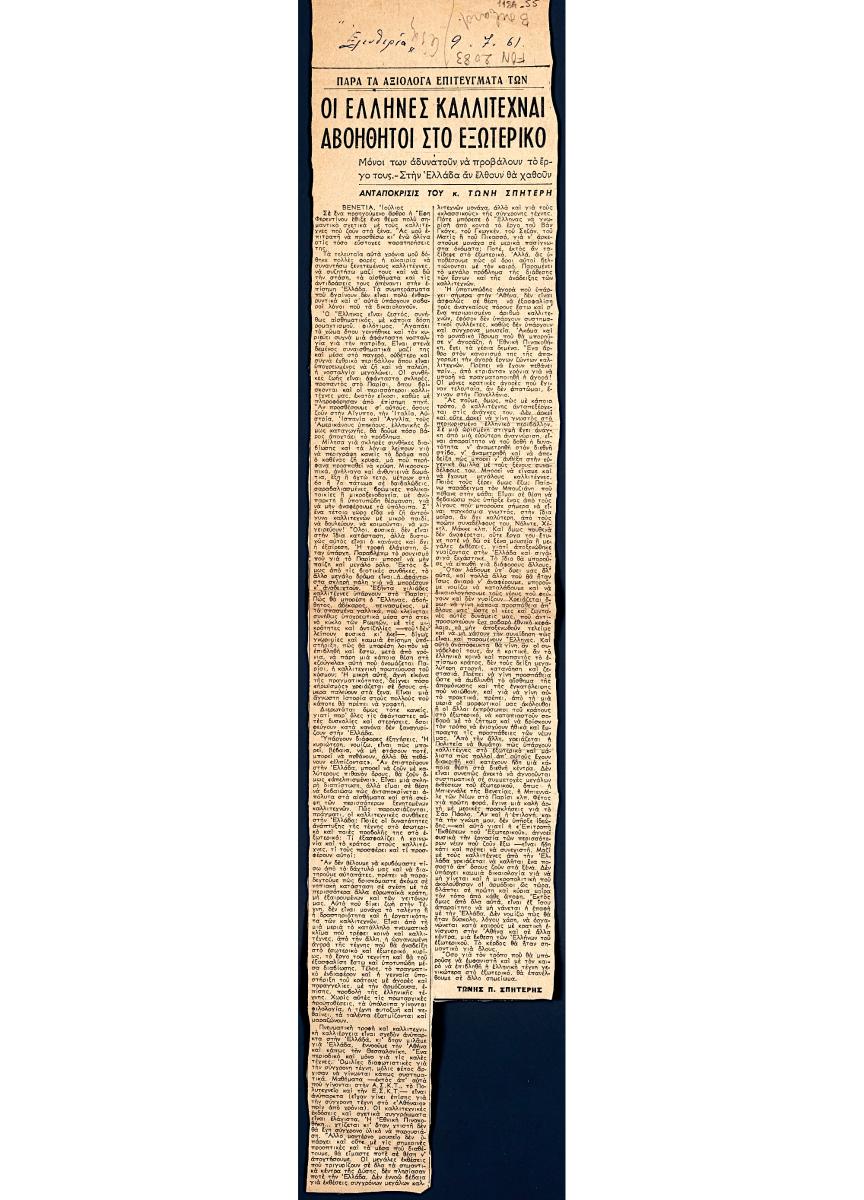 A clipping from the newspaper “Eleftheria”, dated July 9, 1961, featuring an article by Greek art critic Tonis Spiteris about the situation Greek artists face abroad.