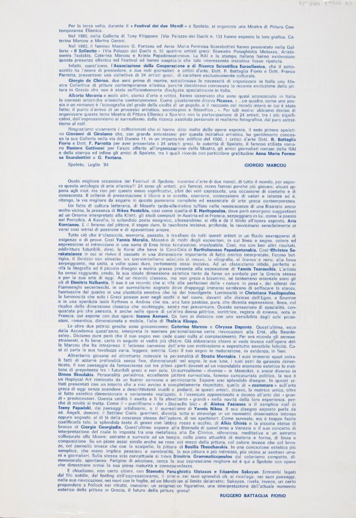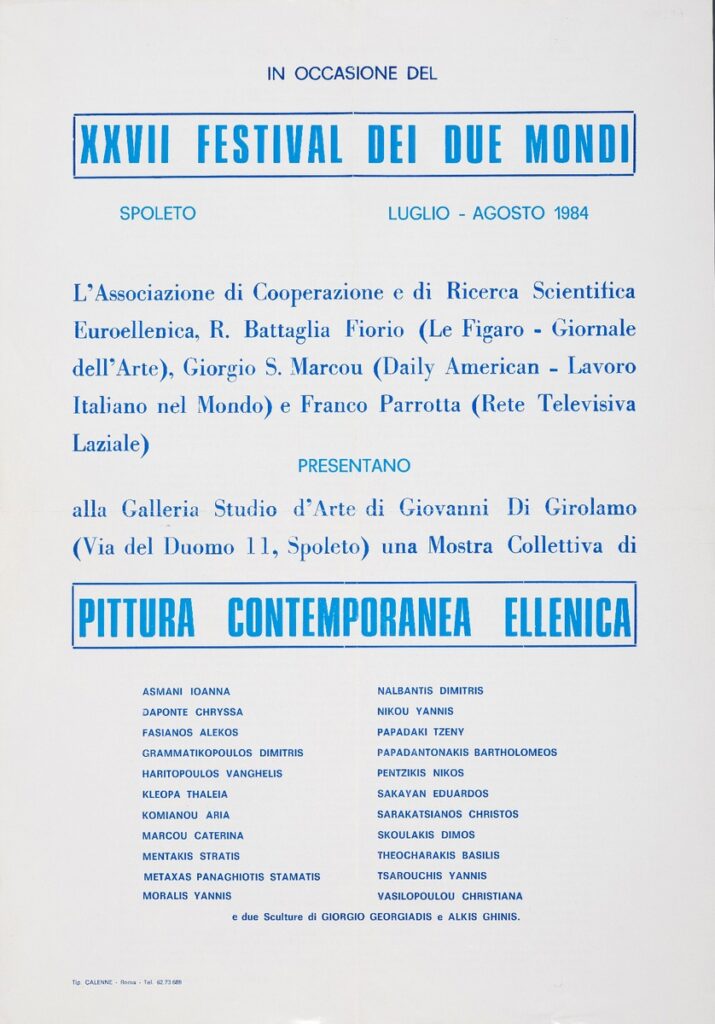 Poster for a group exhibition, which took place at the Galleria Studio d”Arte di Giovanni Di Girolamo, in Spoleto in 1984, within the “XXVII Festival dei due mondi”.