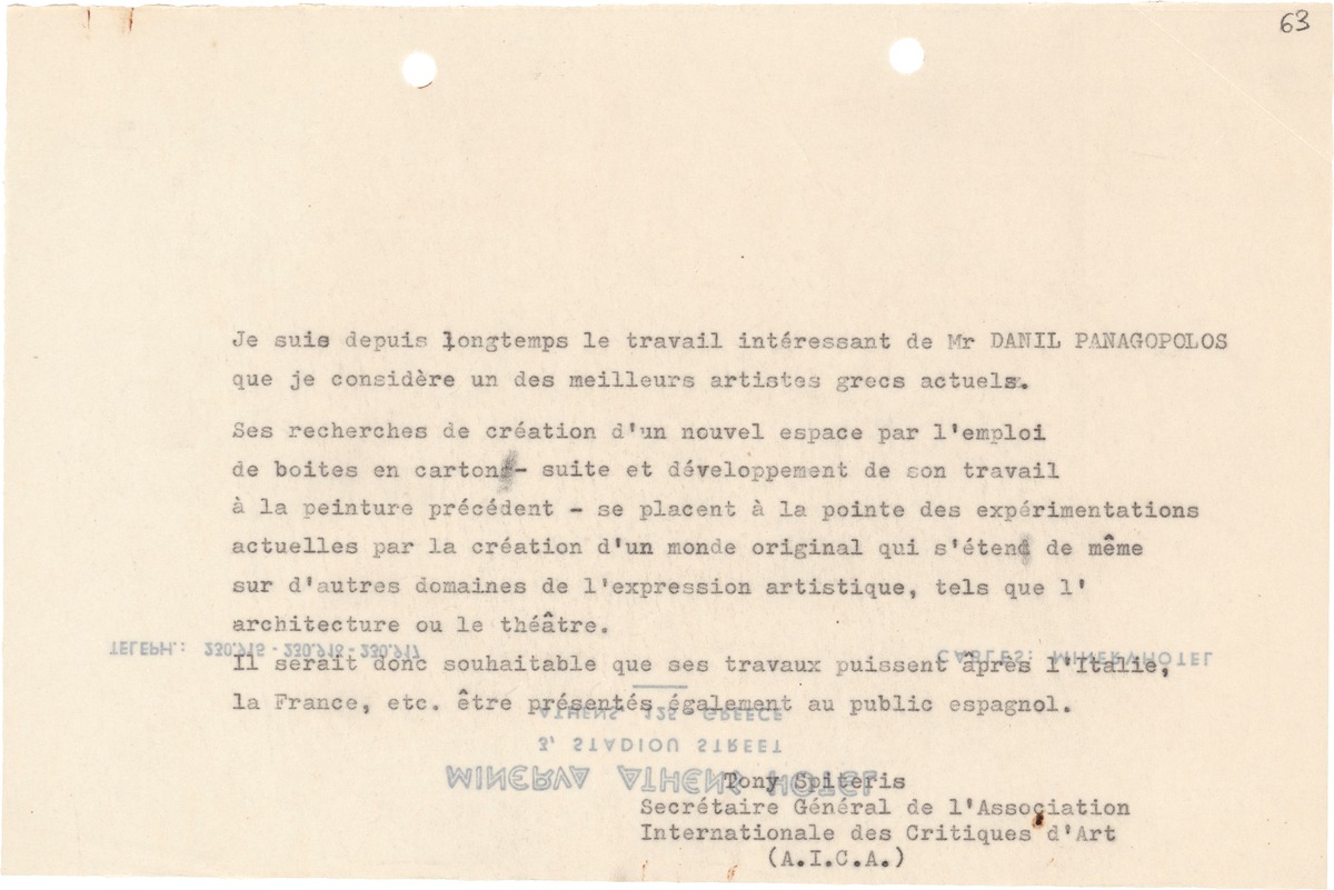 Draft of a recommendation letter of Tonis Spiteris for the Greek artist Danil (Panagopoulos)