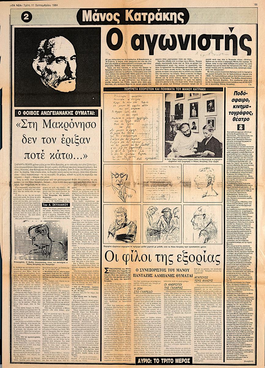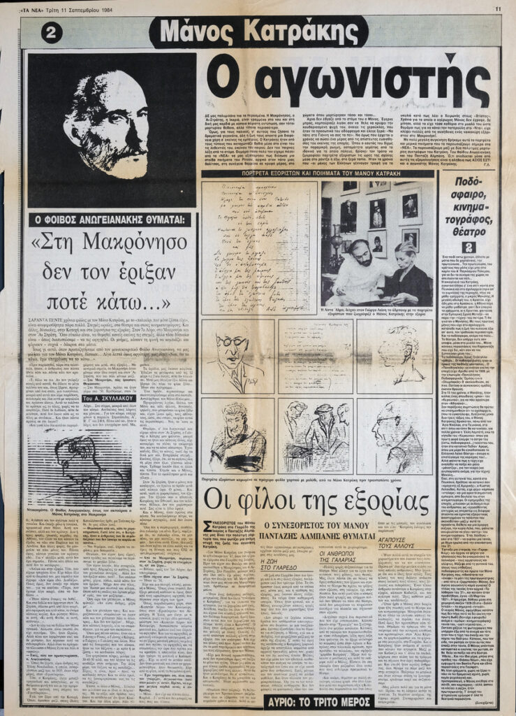 A clipping from the newspaper “Ta Nea”, dated September 11, 1984, featuring a tribute to the Greek actor Manos Katrakis.