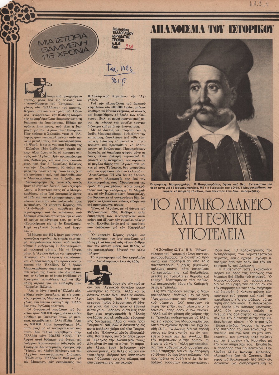 A clipping from the magazine “Taxydromos”, dated January 31, 1975, where a text by the fighter of the Greek Revolution Karpos Papadopoulos regarding the loan of the newly established Greek state from Great Britain in 1824.