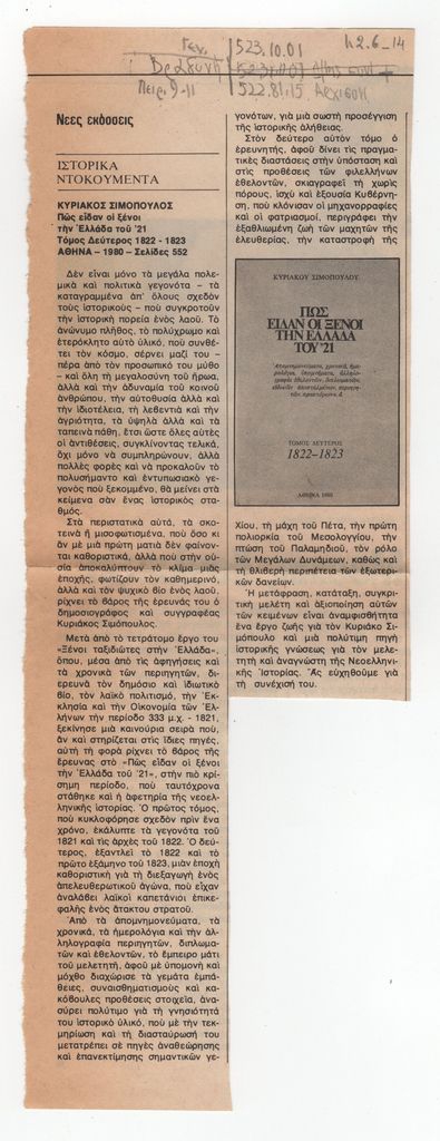 Σιμόπουλος, Κυριάκος, "Πώς είδαν οι ξένοι την Ελλάδα του '21", Αθήνα, 1984.