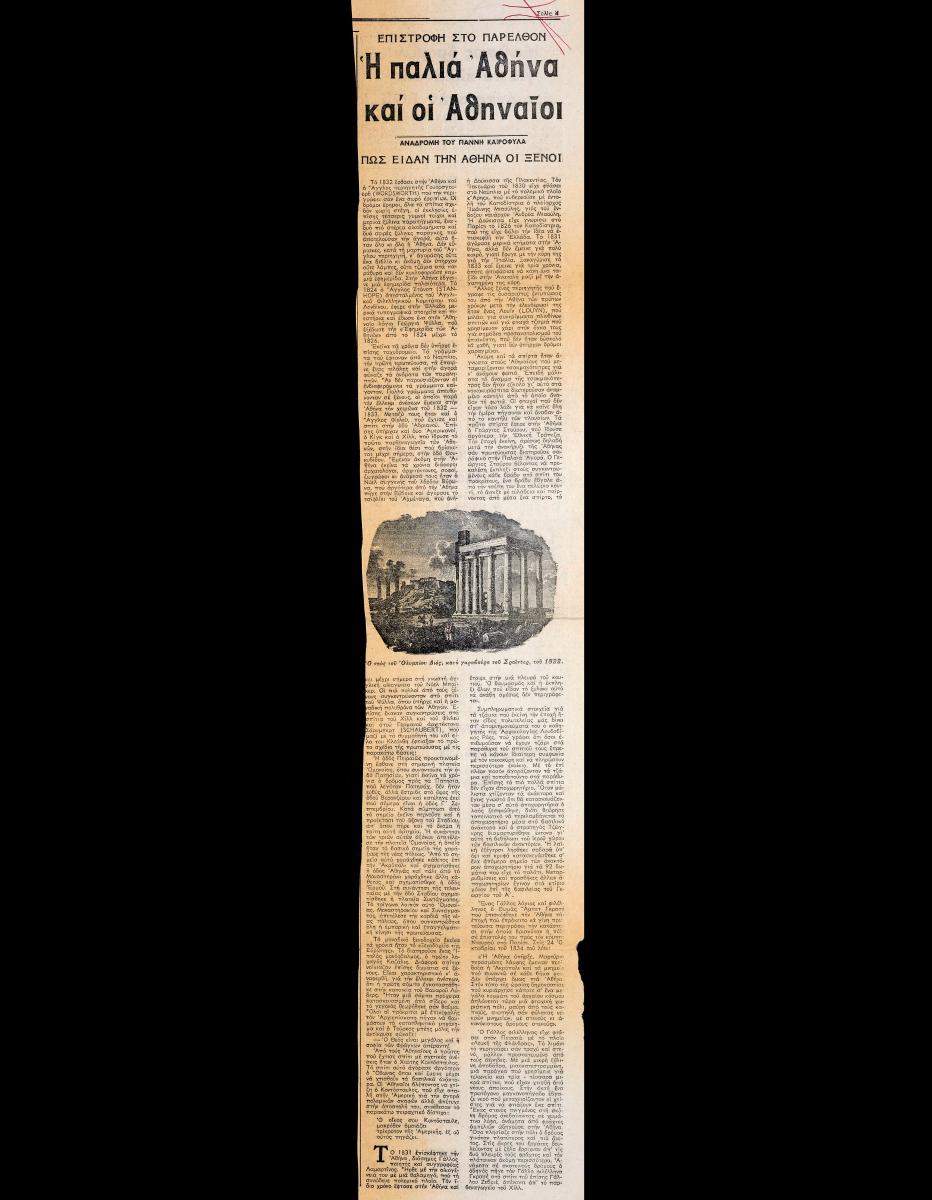 A newspaper clipping, featuring an article about the impressions of travelers in Athens in the early 19th century.