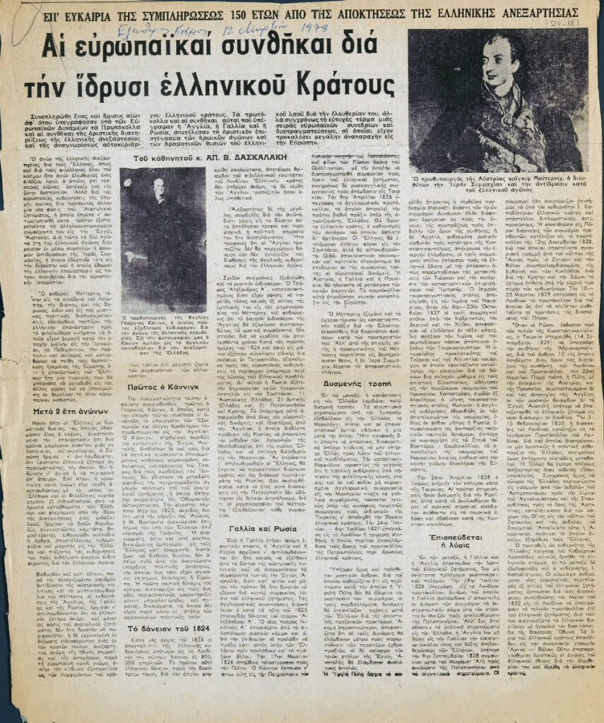 A clipping from the newspaper “Eleftheros Cosmos” dated March 12, 1978, featuring an article about the conditions of the European powers that determined the establishment of the Greek State.