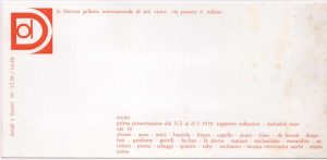Michelangelo Pistoletto ; Mario Merz ; Emilio Vedova ; Toti Scialoja ; Γιάννης Κουνέλλης (1936 - 2017) ; Filippo Brunelleschi (1377 - 1446) ; Giovanni Spadolini ; Giulio Paolini ; Francesconi Anselmo (1921 - 2004) ; Luciano Fabro ; Luigi Tassinari ; Giuseppe Chiari ; Fabio Mauri ; Vettor Pisani