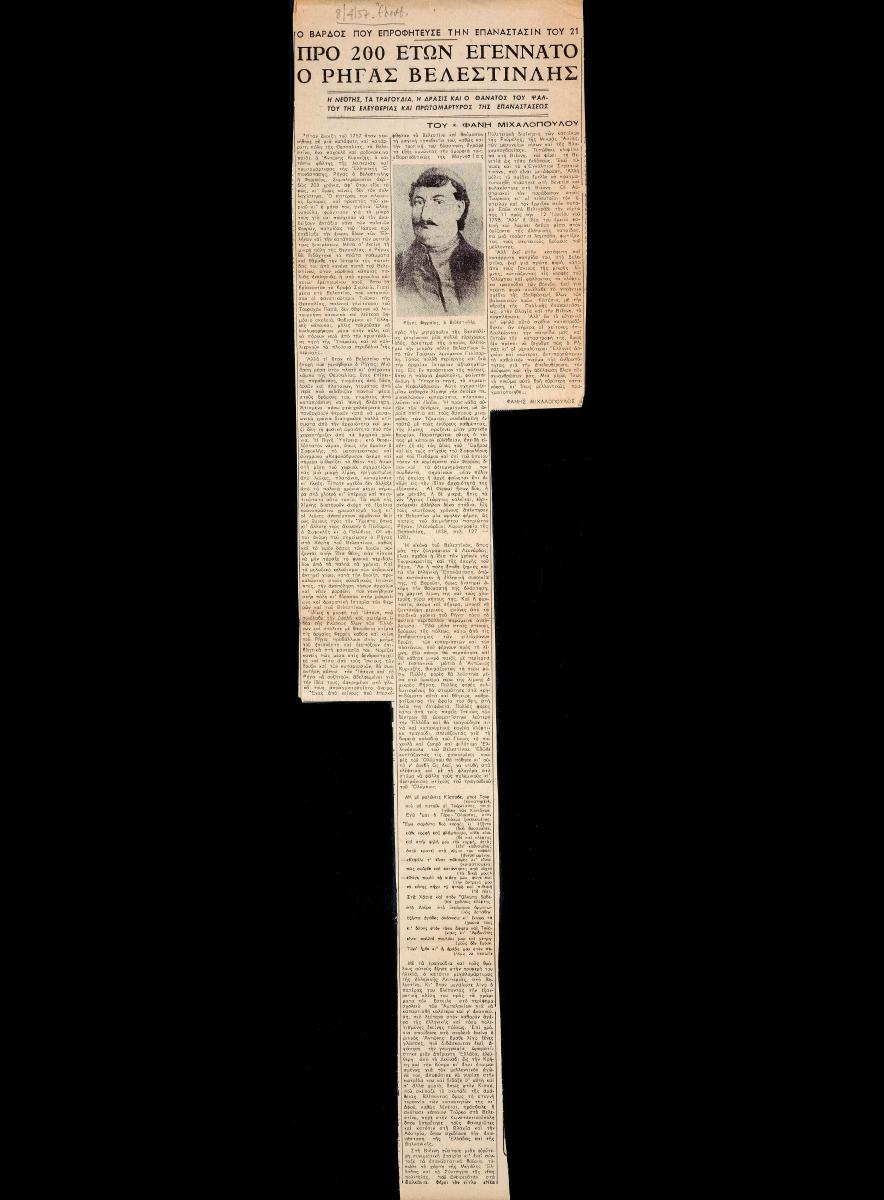 A clipping from the newspaper “Eleftheria”, dated April 8, 1957, featuring an article about Rigas Velestinlis (Feraios) on the occasion of the 200th anniversary of his birth. The article provides information about his place of origin, his childhood, his time in Vienna, and his return to his homeland, where he actively participated in the Greek liberation struggle against the Turks.