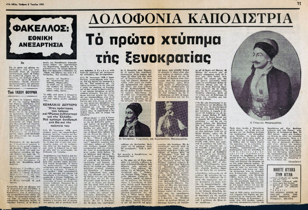 A clipping from the newspaper “Ta Nea”, dated June 3, 1981, featuring a follow-up article which refers to the assassination of Ioannis Kapodistrias.