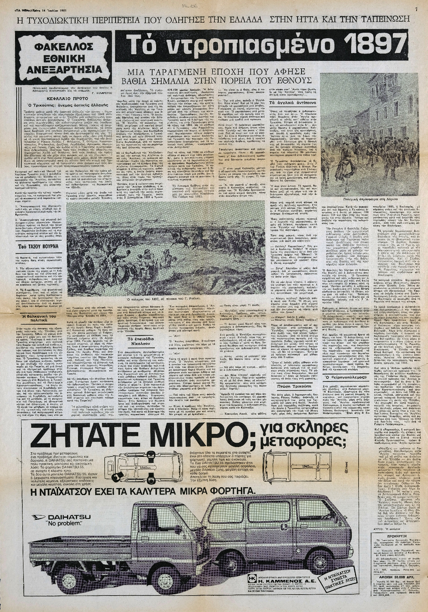 A clipping from the newspaper Ta Nea, dated July 14, 1981, featuring a tribute to the Greek defeat of 1897. The article provides historical details and information about Trikoupis’ policies.